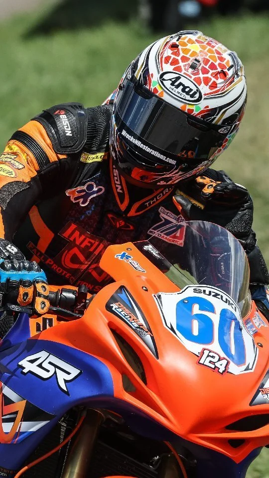 Carl Soltisz is a MotoAmerica/AMA professional road racer and multi-time ASRA/CCS national champion from Springfield Township, MI. Unlike many pro road racers who started racing at a very young age, Carl didn’t have the opportunity to start racing until the age of 19. Protective parents meant motorcycle racing was off-limits to him while growing up. However, as soon as he was old enough to set off on his own, he bought an old race bike and dove headfirst into the sport. Right away he made a name for himself at local club racing events, advancing quickly through the ranks to earn his Pro license in 2014. Affectionately nicknamed Super Carl due to his on-track exploits, he has established himself as a fan favorite and local legend in the Midwest region.