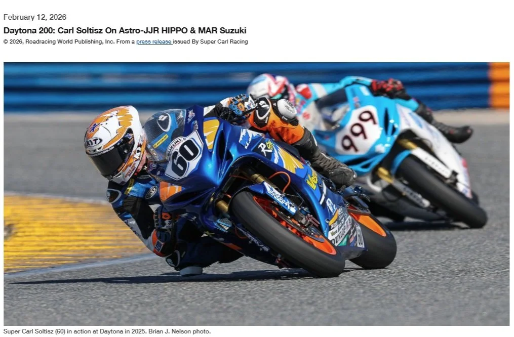 Feb 2026 Daytona 200: Carl Soltisz on Astro-JJR HIPPO & MAR Suzuki June 2025 102nd Loudon Classic Race Results June 2025 102nd Loudon Classic Qualifying June 2025 MotoAmerica: Supersport Race Two Results From Road America May 2025 MotoAmerica: Supersport Race One Results From Road America May 2025 MotoAmerica: Supersport Race Two Results From Road Atlanta May 2025 MotoAmerica: Supersport Race One Results From Road Atlanta Mar 2025 MotoAmerica: Results From The 83rd Daytona 200 Mar 2025 MotoAmerica: Supersport Warm Up at Daytona Mar 2025 MotoAmerica: Supersport Time Attack Final Qualifying at Daytona Mar 2025 MotoAmerica: Supersport Qualifying 2 at Daytona Mar 2025 MotoAmerica: Supersport Qualifying 1 at Daytona Mar 2025 MotoAmerica: Supersport Practice 1 at Daytona Oct 2024 ASRA Race of Champions Results From Daytona Sept 2024 MotoAmerica: Supersport Race Two Results From NJMP Sept 2024 MotoAmerica: Supersport Race One Results From NJMP Sept 2024 MotoAmerica: Supersport Race Two Results From COTA Sept 2024 MotoAmerica: Supersport Race One Results From COTA Aug 2024 MotoAmerica: Supersport Race Two Results From Mid-Ohio Aug 2024 MotoAmerica: Supersport Race One Results From Mid-Ohio July 2024 MotoAmerica: Supersport Race Two Results From Laguna Seca July 2024 MotoAmerica: Supersport Race One Results From Laguna Seca June 2024 MotoAmerica: Supersport Race Two Results From Ridge June 2024 MotoAmerica: Supersport Race One Results From Ridge June 2024 MotoAmerica: Supersport Race Two Results From Brainerd June 2024 MotoAmerica: Supersport Race One Results From Brainerd June 2024 101st Loudon Classic Race Results June 2024 101st Loudon Classic Qualifying June 2024 MotoAmerica: Supersport Race Two Results From Road America June 2024 MotoAmerica: Supersport Race One Results From Rainy Road America May 2024 MotoAmerica: Supersport Race Two Results From Barber May 2024 MotoAmerica: Supersport Race One Results From Barber Apr 2024 MotoAmerica: Supersport Race Two Results From Road Atlanta Apr 2024 MotoAmerica: Supersport Race One Results From Road Atlanta Mar 2024 MotoAmerica: 82nd Daytona 200 Race Results Oct 2023 Sponsorship Opportunity: KYT Americas